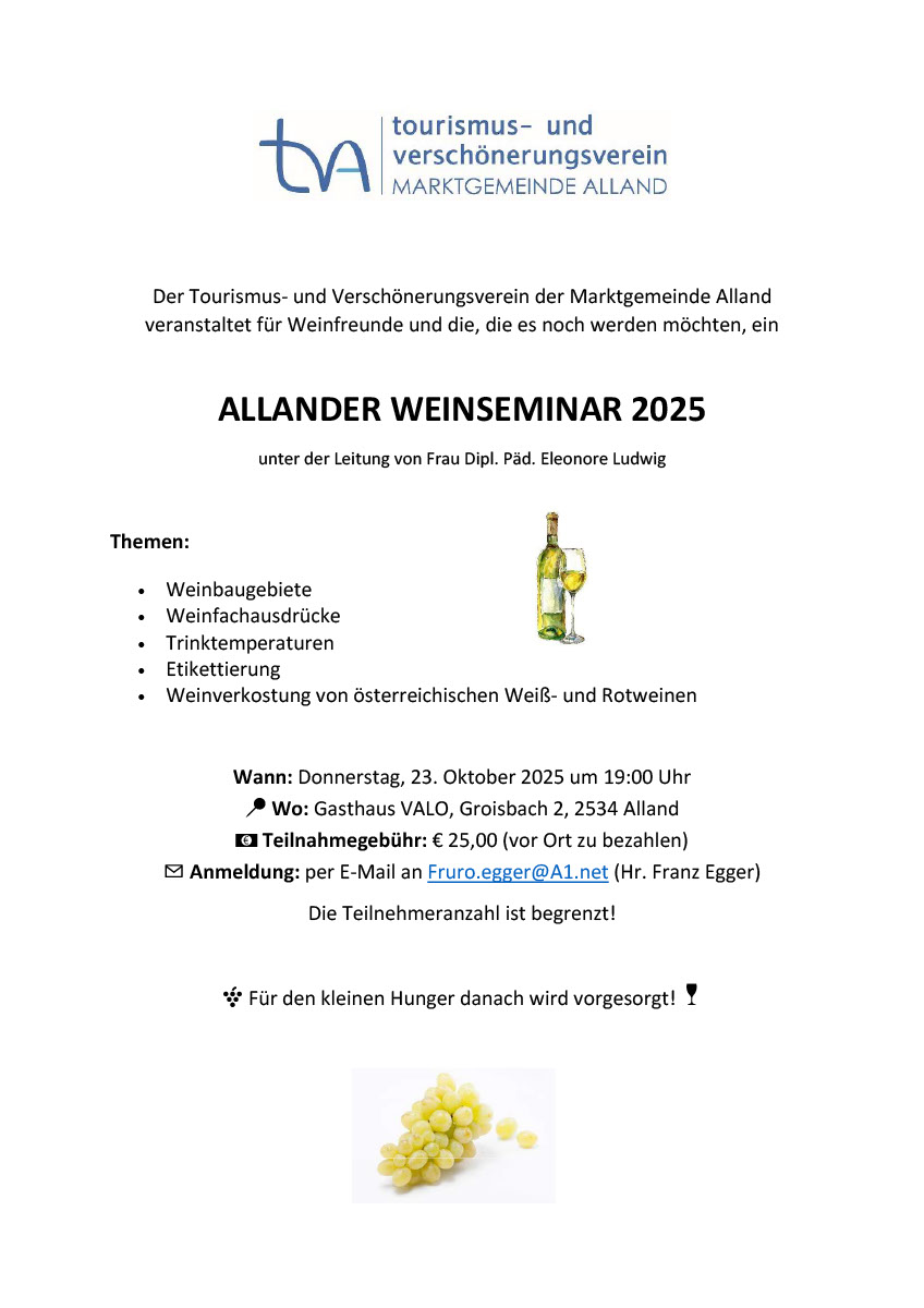 Am 23. Oktober 2025 wird um 19 Uhr im Gasthaus VALO (Groisbach 2, 2534 Alland) ein Weinseminar durchgeführt.