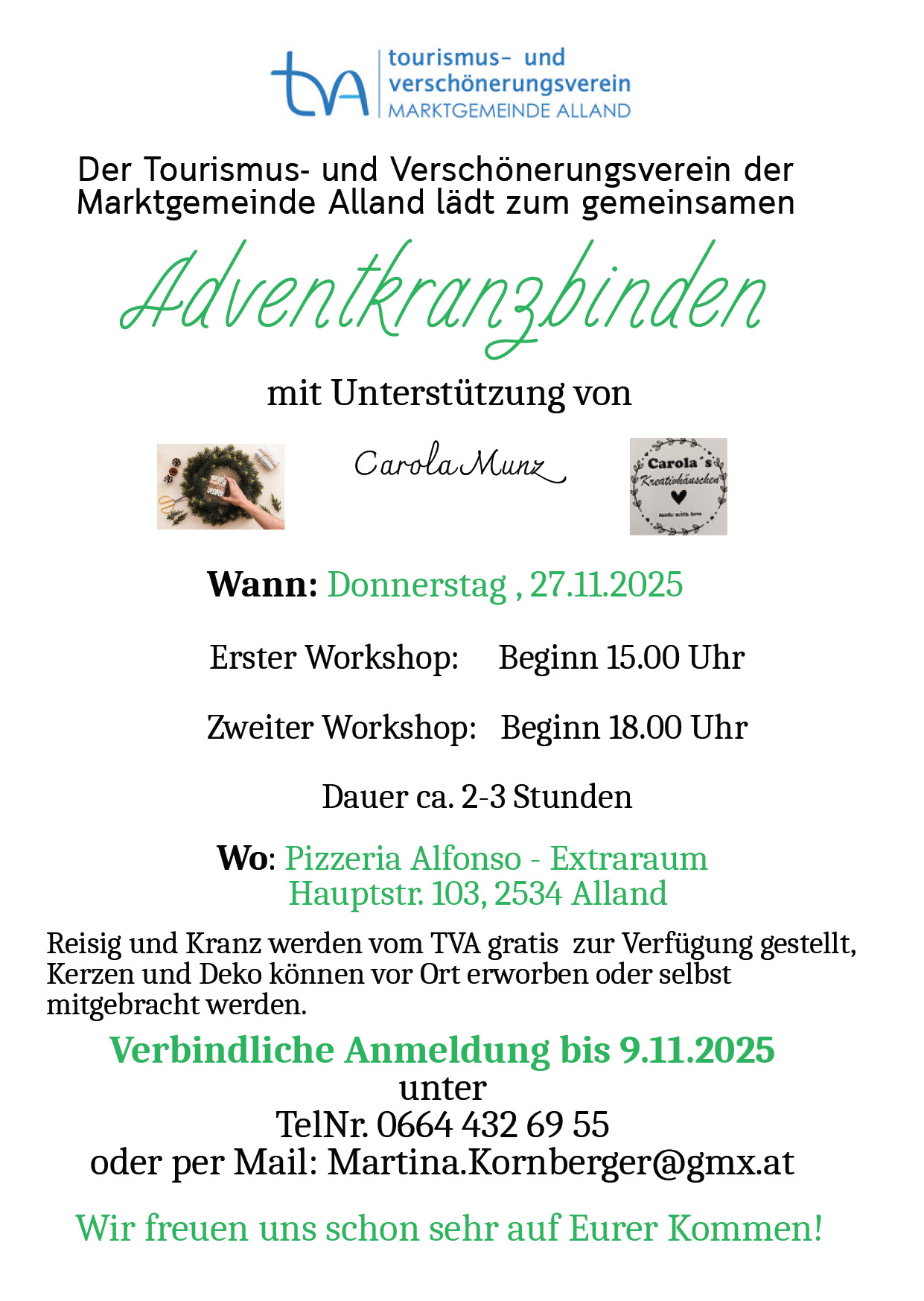 Verbindliche Anmeldung bis 9. November 2025 bei Martina Kornberger unter +436644326955 oder per Mail unter martina.kornberger@gmx.at